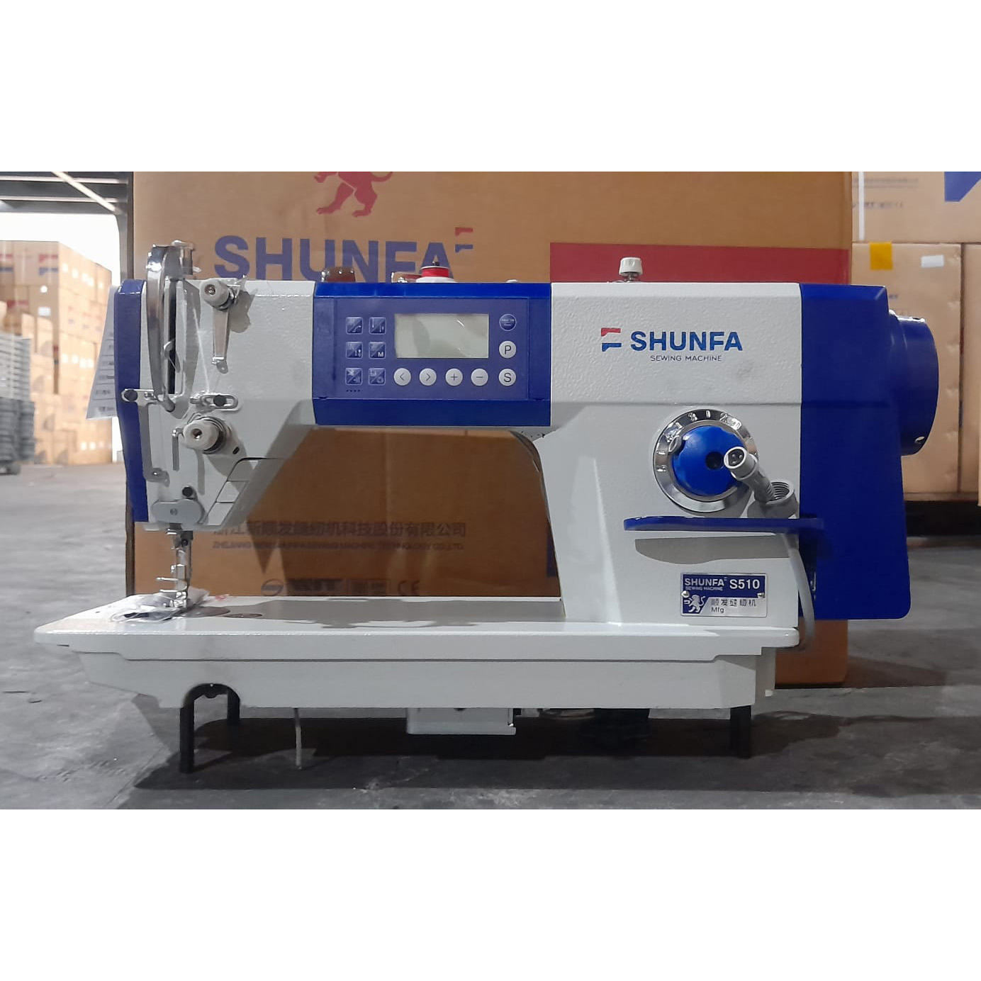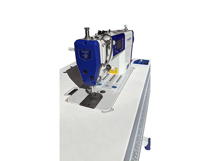 ماكينة SHUNFA S510 صناعية ذات إبرة واحدة مع محرك مؤازر مدمج وشاشة LCD ووظائف أوتوماتيكية وإضاءة خلفية LED ونظام تزييت تلقائي. يستخدم لخياطة الأغراض المصنوعة من مواد خفيفة ومتوسطة لخياطة جميع أنواع الملابس والمنسوجات المنزلية والملابس الأخرى.