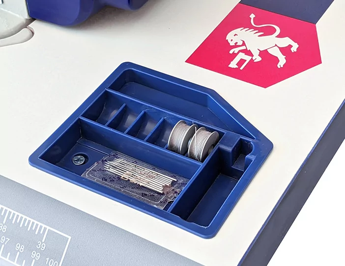 توجد في منطقة شريط الإبرة وحدة تحكم في الماكينة بها 3 أزرار: زر إنهاء الغرزة: ضغطة واحدة – غرزة واحدة، إذا قمت بالضغط على الزر، فستقوم ماكينة الخياطة بالخياطة بأقل سرعة؛ زر 1/2 غرزة: ضغطة واحدة تجعل نصف طول الغرزة المحدد، إذا قمت بالضغط على الزر، فسوف تقوم ماكينة الخياطة بالخياطة بأقل سرعة؛ زر التثبيت اليدوي: لإجراء التثبيت، تحتاج إلى الضغط باستمرار على الزر وبدء الخياطة (الزر يغير اتجاه الخياطة فقط، لكنه لا يخيط).